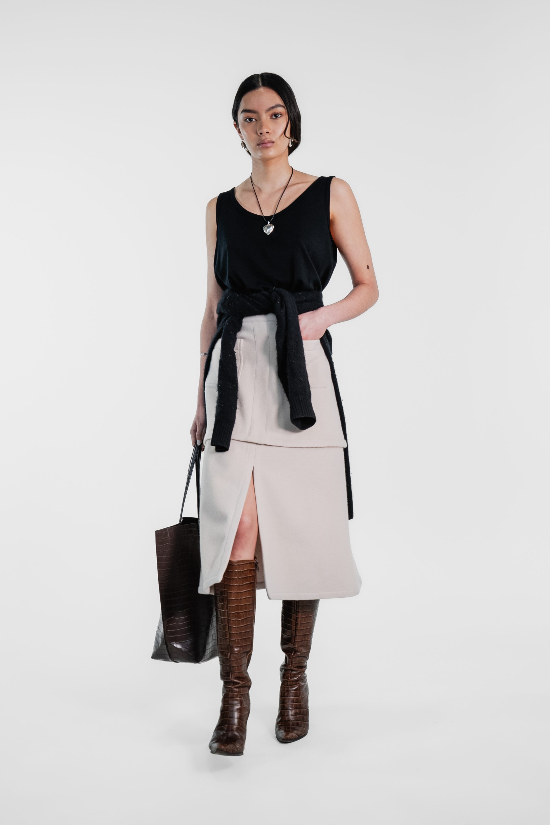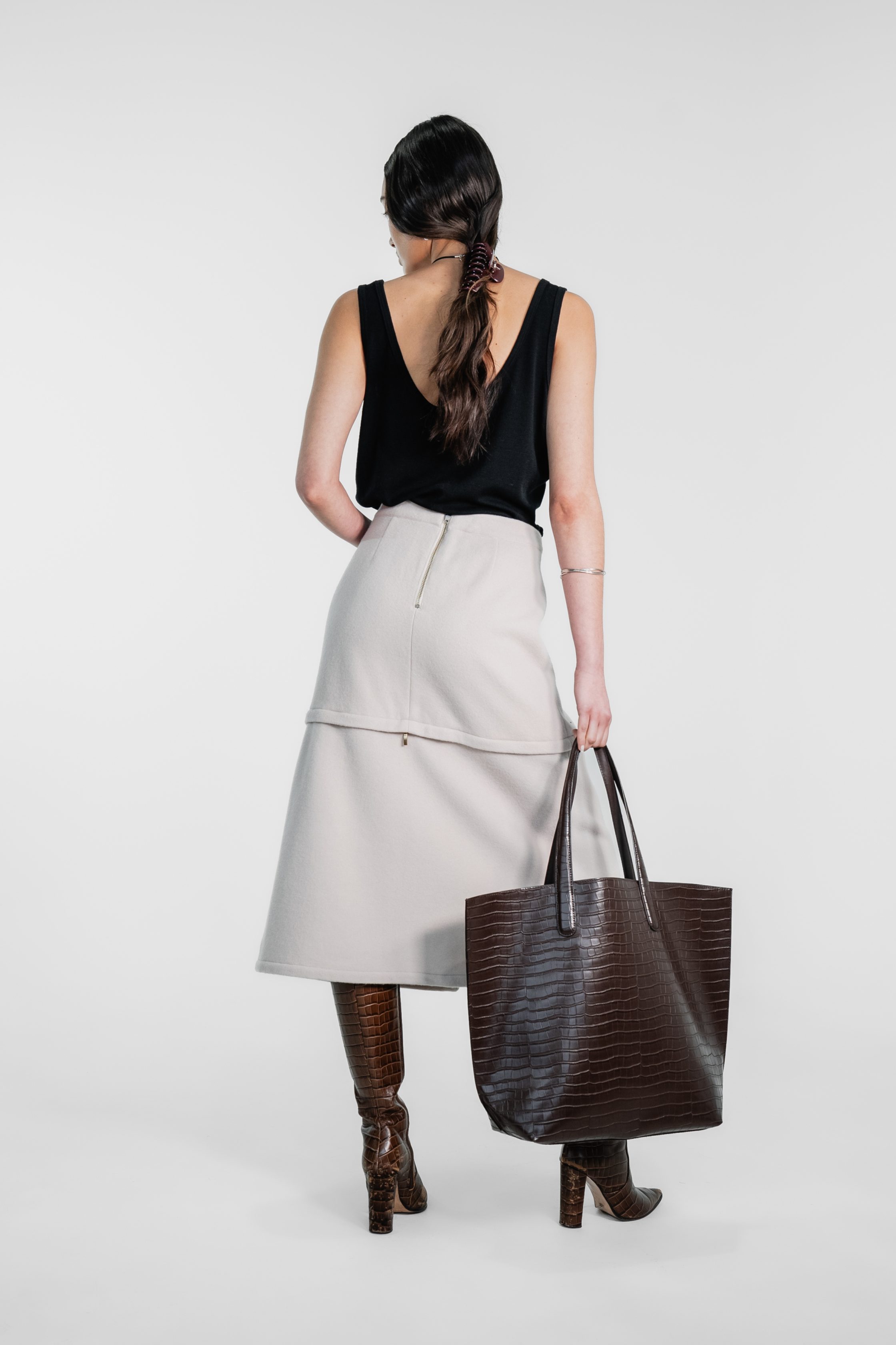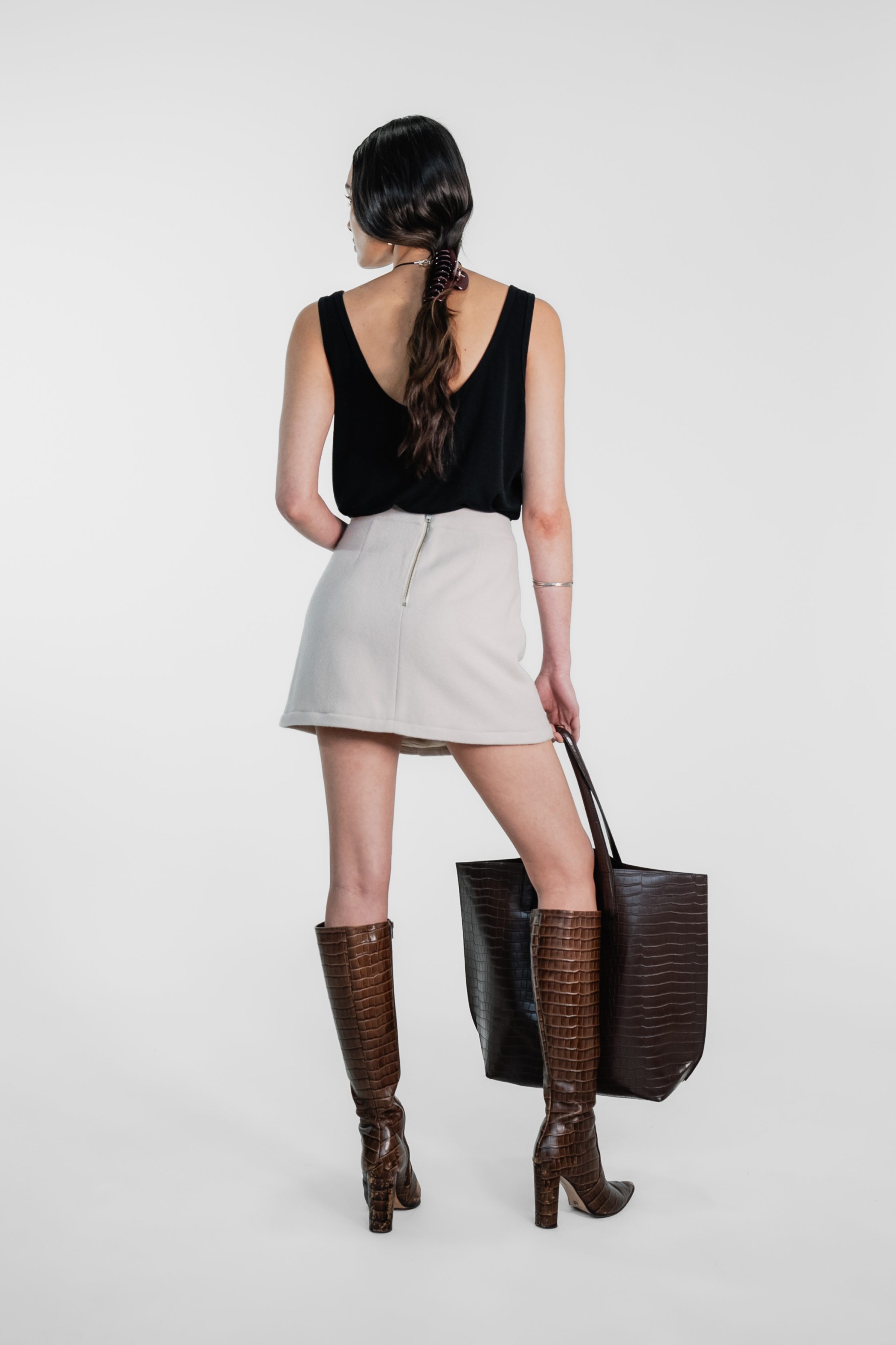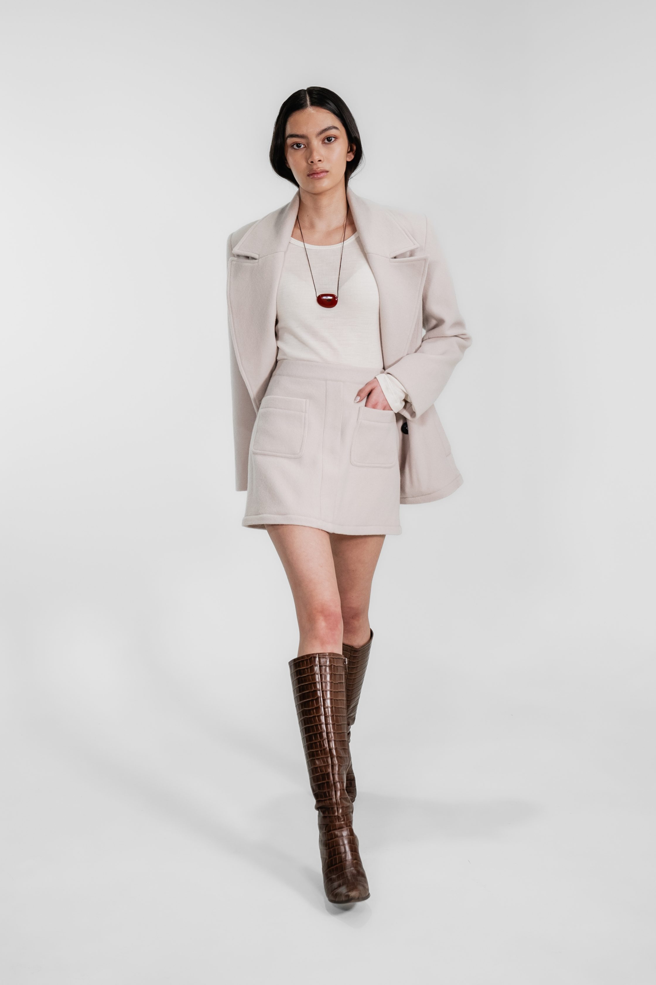 Crafted from 100% premium wool, the Sade skirt is rich in texture, defined by a subtle A-line silhouette. A discreet zip transforms this garment into a sleek mini skirt, offering two distinct looks in one. Its clean lines and luxurious wool make it a timeless wardrobe essential.
