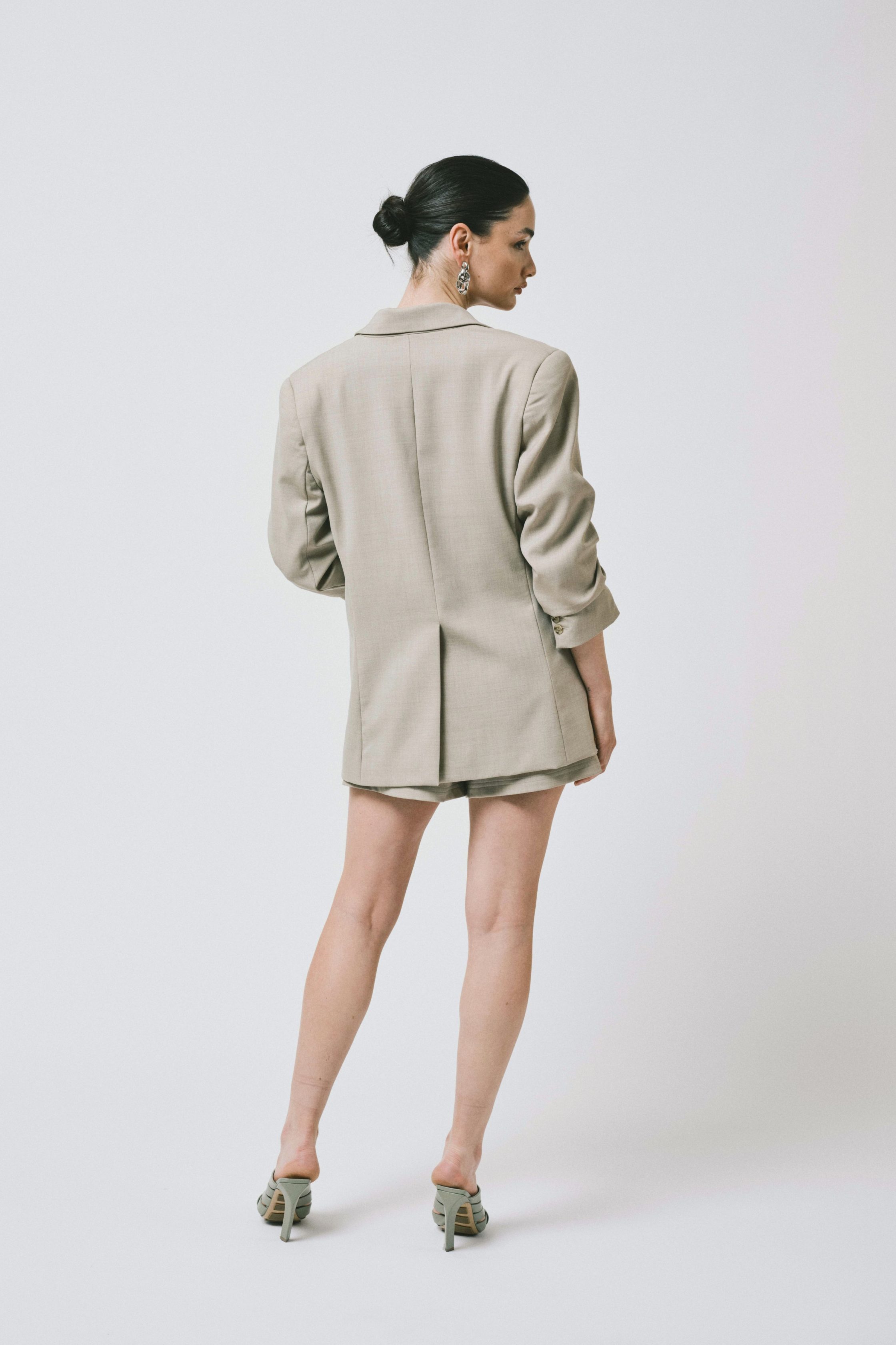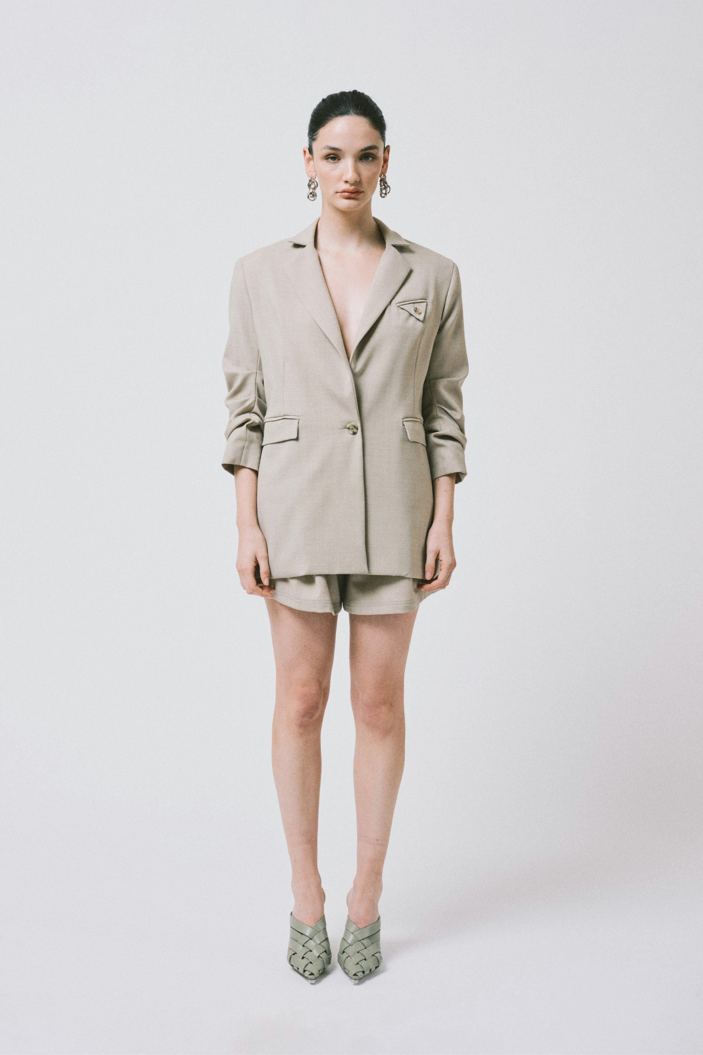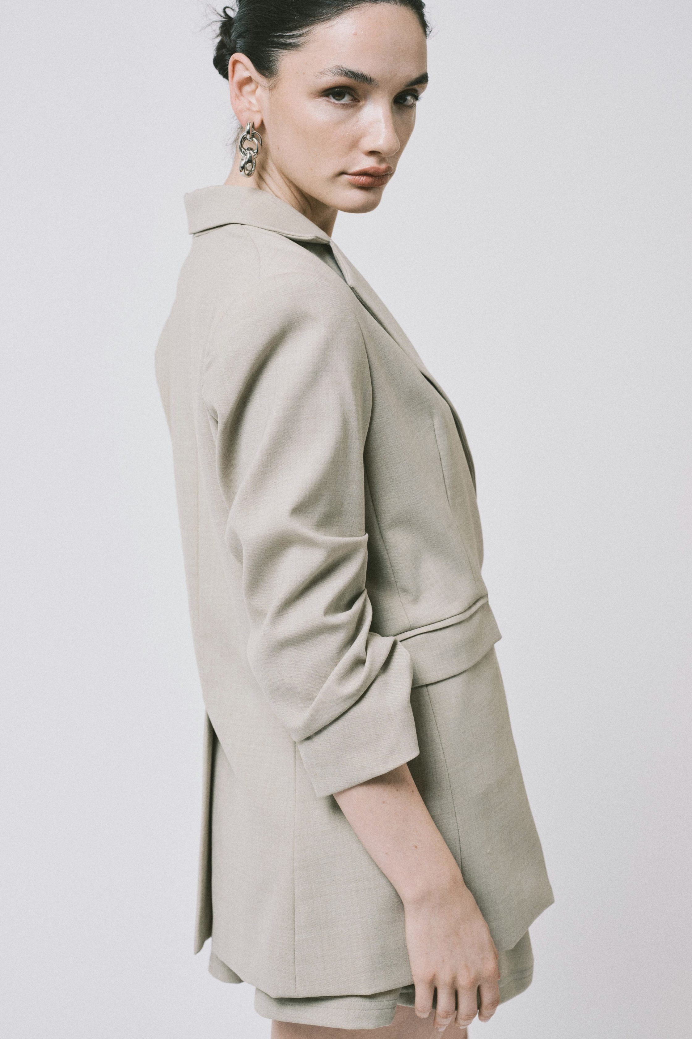 An Australian-made wool blazer with ruched sleeves that stay effortlessly in place.
